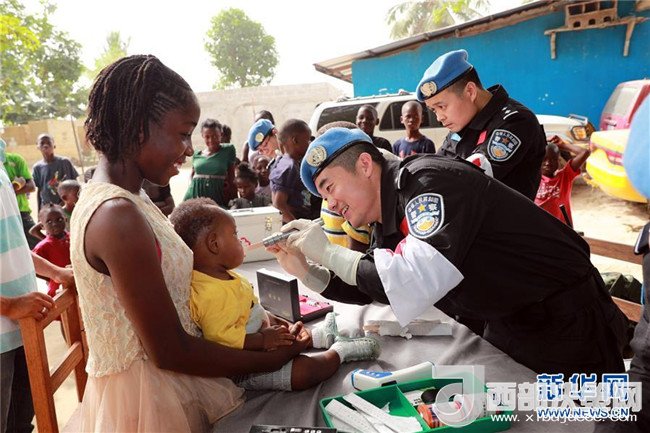 2017年12月28日,在利比里亞蒙羅維亞,中國(guó)維和警察防暴隊(duì)醫(yī)療人員為兒童做口腔檢查。當(dāng)日,中國(guó)第五支駐利比里亞維和警察防暴隊(duì)派出醫(yī)護(hù)人員前往蒙羅維亞市本森威爾社區(qū)孤兒院,為兒童和員工進(jìn)行義診。(趙小新攝)