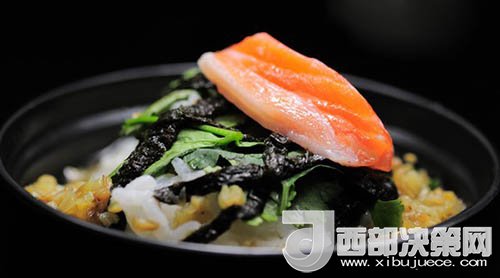4、在碗中盛入米飯,加入三文魚、紫菜、蔥花、芝麻,并以適量芥末、醬油和鹽調(diào)味;