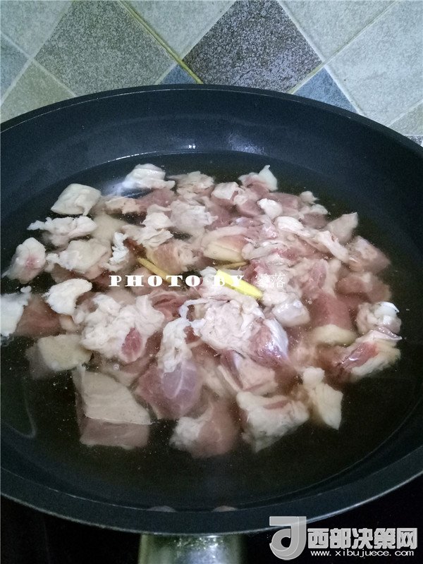 2.鍋里倒入適量清水,放入牛腩,2片姜,1顆蔥白段,適量料酒,大火燒開;