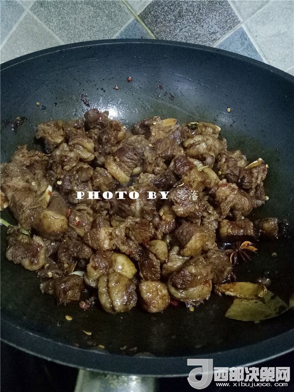5.放入冰糖,炒出糖色后,再放入牛腩肉,翻炒上色;
