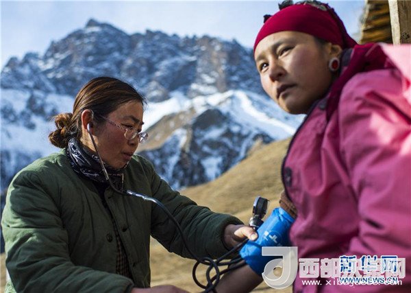 巡診隊里唯一的女醫(yī)生張紅英(左)在為牧民檢查身體(2017年12月18日攝)。