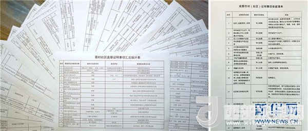 拼版照片:左圖為2017年4月23日在四川成都拍攝的清理前的313項村(社區(qū))需要開具的證明事項目錄;右圖為2017年4月24日拍攝的清理后的15項村(社區(qū))需要開具的證明事項目錄。 新華社記者薛玉斌攝