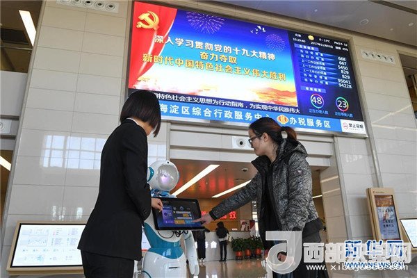 在北京市海淀區(qū)綜合行政服務(wù)中心,工作人員(左)向一名女士介紹智能引導(dǎo)機器人的使用方法(2017年11月3日攝)。 新華社記者申宏攝