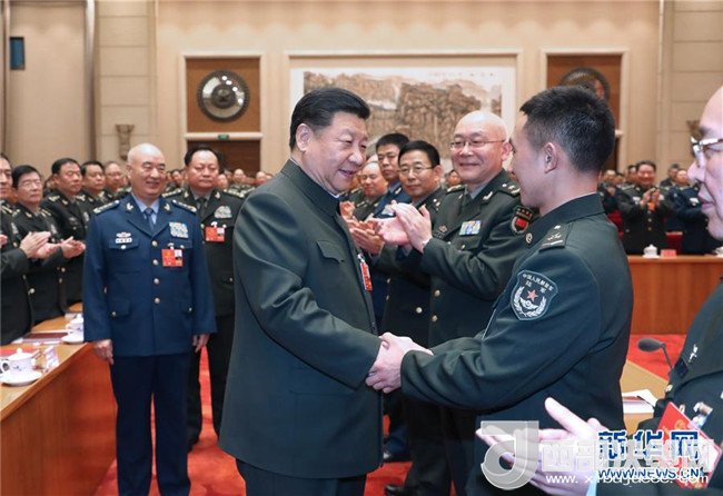 3月12日上午,中共中央總書記、國家主席、中央軍委主席習(xí)近平出席十三屆全國人大一次會(huì)議解放軍和武警部隊(duì)代表團(tuán)全體會(huì)議。這是會(huì)議開始前,習(xí)近平親切接見與會(huì)代表。新華社記者 李剛 攝