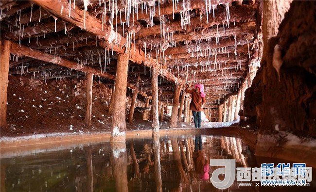 鹽農(nóng)在整理鹽田鹵水滲下形成的鹽柱(3月11日攝)。