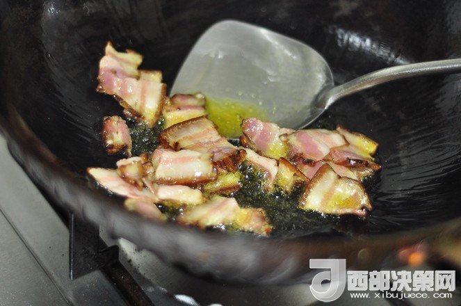 7.下入臘肉和臘腸煸炒一下。
