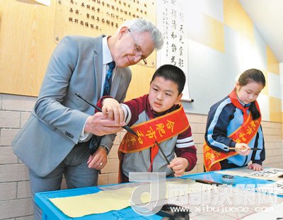 加拿大客人和小學生一起學書法