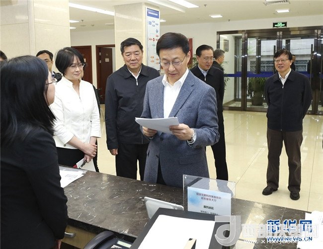 4月3日,中共中央政治局常委、國務(wù)院副總理韓正到國家發(fā)展改革委調(diào)研并主持召開座談會。這是韓正在國家發(fā)展改革委政務(wù)服務(wù)大廳考察。新華社記者 龐興雷 攝