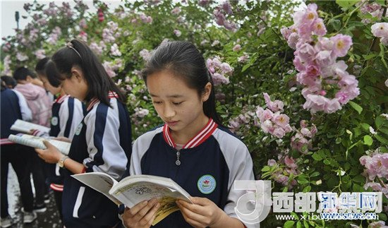 木魚中學(xué)的學(xué)生們?cè)谛@的鮮花叢中閱讀課文(4月24日攝)。