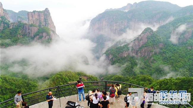 5月1日,游人在浙江省仙居縣神仙居景區(qū)游覽。當日,雨后的神仙居景區(qū)云霧繚繞,山巒若隱若現。新華社發(fā) 王華斌 攝
