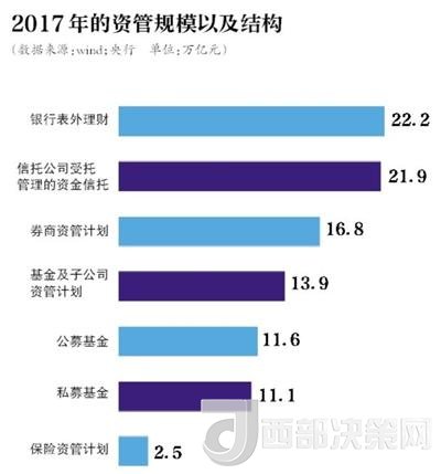 數(shù)據(jù)顯示,近年來我國金融機(jī)構(gòu)資管業(yè)務(wù)規(guī)模不斷攀升,截至2017年末,不考慮交叉持有因素,總規(guī)模已達(dá)百萬億元。其中,銀行表外理財產(chǎn)品資金余額為22.2萬億元,信托公司受托管理的資金信托余額為21.9萬億元,公募基金、私募基金、證券公司資管計劃、基金及其子公司資管計劃、保險資管計劃余額分別為11.6萬億元、11.1萬億元、16.8萬億元、13.9萬億元、2.5萬億元。