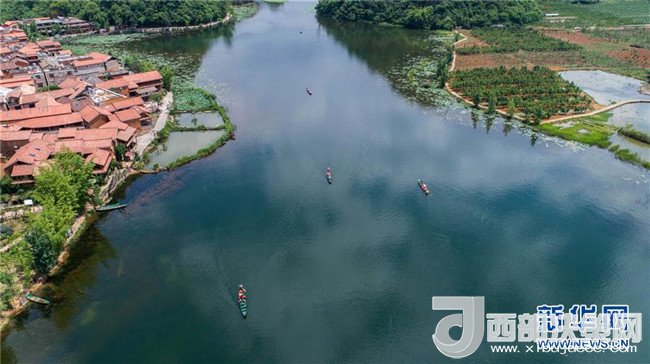 游人在普者黑國家濕地公園蕩舟休閑、觀賞美景(5月26日無人機(jī)拍攝)。