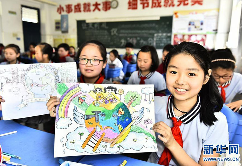 合肥市蜀山區(qū)井崗鎮(zhèn)新城小學(xué)學(xué)生展示自己在“善待地球,童繪藍(lán)天——我與地球的故事”繪畫活動(dòng)中的作品(4月19日攝)。新華社發(fā)(葛宜年 攝)