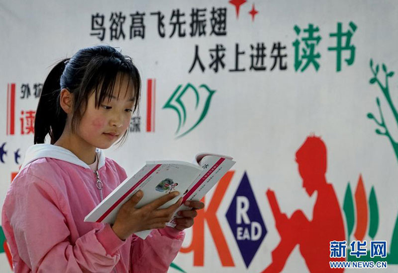 河南焦作市博愛(ài)縣寨豁鄉(xiāng)小學(xué)學(xué)生郭艷冰在校內(nèi)閱讀從“焦作市圖書館館外流通點(diǎn)”借閱的書籍(4月18日攝)。新華社記者 李安 攝