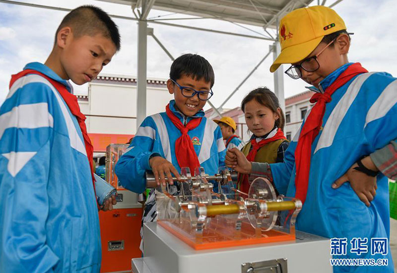 幾名學(xué)生在拉薩市流動(dòng)科技館巡展活動(dòng)現(xiàn)場(chǎng)體驗(yàn)科學(xué)小實(shí)驗(yàn)(5月24日攝)。 新華社記者 劉東君 攝