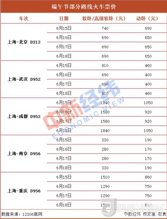 其中,端午節(jié)前一日(15日)和最后一日(18日)的火車票價格較高,與16日、17日相比,要高出20-260元不等。以上海-成都D952車次為例,15日高級軟臥票價比16日高出260元,15日動臥票價比16日高出130元。因此,建議有條件的小伙伴提前或延后出行。