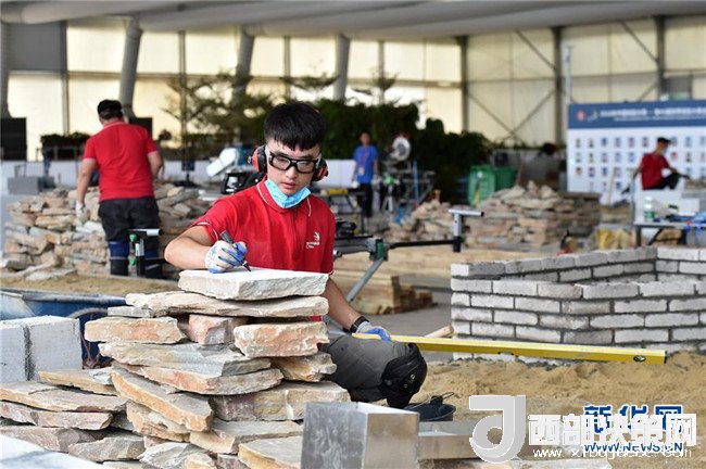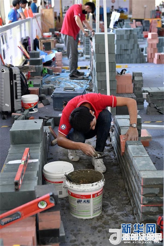 在第45屆世界技能大賽全國選拔賽廣東賽區(qū)比賽現(xiàn)場,選手們在砌筑項(xiàng)目中進(jìn)行操作(6月25日攝)。新華社記者 梁旭 攝