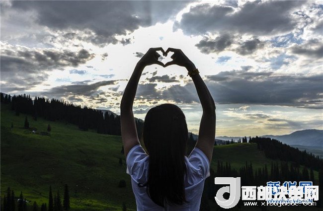 在那拉提景區(qū)天成臺,一位游客迎著夕陽做出了“心”的動作(7月8日攝)。
