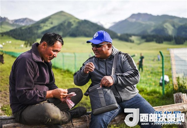 那拉提“空中草原”游牧人家馬隊的兩位牧民正在數(shù)當(dāng)日的收入(7月8日攝)。