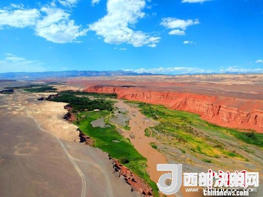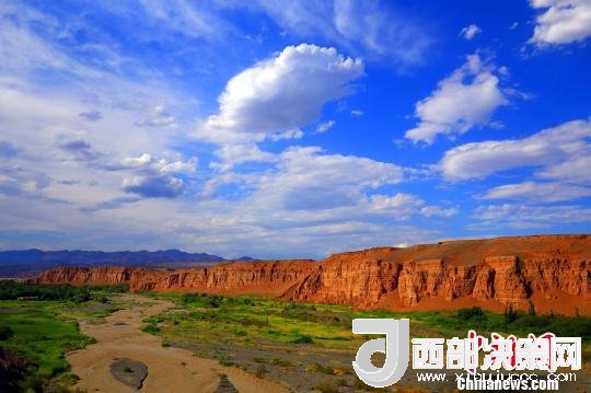站在天山紅河谷入口處的斷崖邊,可以清晰地看到遠處的天山,天然的紅土飄帶,一簇簇的綠蔭,坐落有致的農(nóng)家院落?;臎龅母瓯谂c斷崖下的美景,給人以強烈的視覺沖擊。紅色的山巖,猶如一條鑲嵌在天際間的飄帶而光彩奪目,河谷內(nèi)寧靜的村莊透露著幾分神秘。