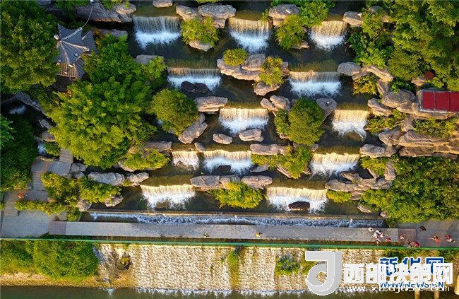 7月29日,市民在廣西柳州市窯埠古鎮(zhèn)人工瀑布群下消暑納涼(無(wú)人機(jī)拍攝)。
