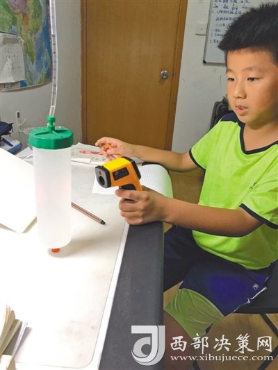 首先設(shè)計(jì)一個(gè)裝置,下部寬大的容器盛水,上部細(xì)長的管子可以觀察水的體積變化。然后將裝滿水的容器放入冰箱冷凍層,形成冰水混合物,此時(shí)水溫接近零攝氏度。最后將容器取出,用手持式測(cè)溫儀測(cè)量水溫……這一系列步驟,不是實(shí)驗(yàn)室里進(jìn)行的專業(yè)研究,而是南京師范大學(xué)附屬小學(xué)四年級(jí)學(xué)生徐子越和王美澄正在做的暑假作業(yè),他們通過觀察水的體積隨溫度的變化,來解釋冰為什么會(huì)浮在水面上。
