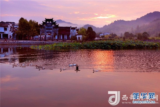 8月4日,色彩絢麗的朝霞,映射安徽皖南西遞古村。