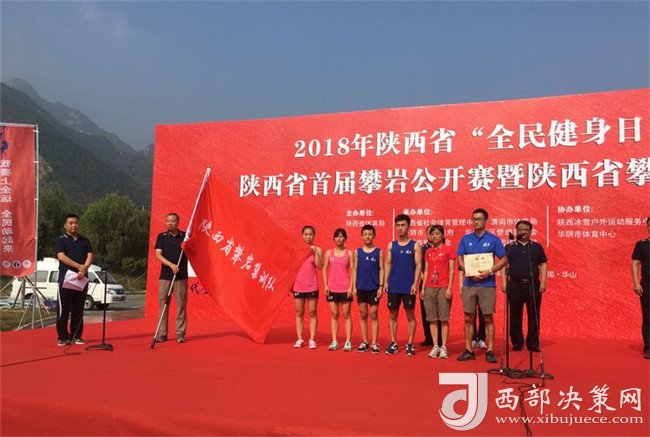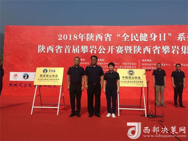 隨后陜西省登山協(xié)會(huì)主席陳錚向省攀巖集訓(xùn)隊(duì)教練組代表邱洪樹授“陜西省攀巖集訓(xùn)隊(duì)”隊(duì)旗,并頒發(fā)聘書。陜西省社會(huì)體育管理中心主任田凱、渭南市體育局副局長王曉燕、陜西華山旅游集團(tuán)有限公司副總經(jīng)理趙江峰同志共同為“陜西省攀巖訓(xùn)練基地”揭牌。