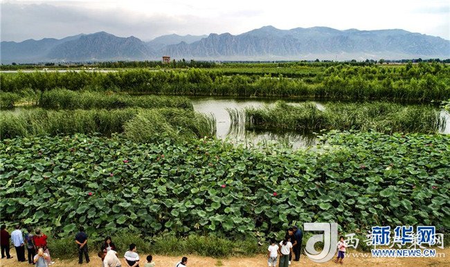 8月22日,游人在廣靈縣壺流河濕地觀賞盛開(kāi)的荷花(無(wú)人機(jī)拍攝)。新華社記者 陶明 攝
