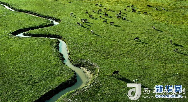 8月22日,牛群在廣靈縣壺流河濕地覓食(無(wú)人機(jī)拍攝)。新華社發(fā)(李濤 攝)