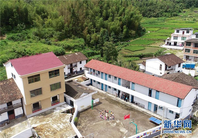 9月4日,陳春英和學(xué)生們在操場上玩游戲(無人機(jī)拍攝)。新華社記者胡晨歡 攝