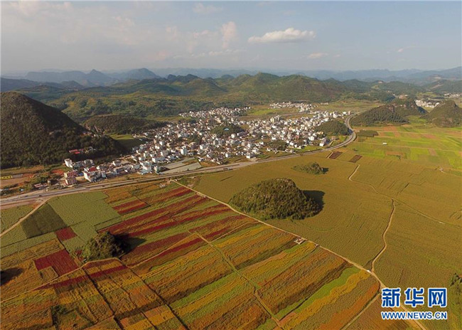 云南羅平的七彩花田(9月5日無人機(jī)拍攝)。 新華社記者楊宗友攝