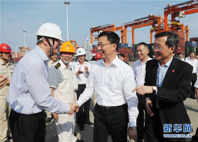 這是9月12日,韓正前往欽州保稅港區(qū),考察南向通道建設(shè)。 新華社記者 劉衛(wèi)兵 攝