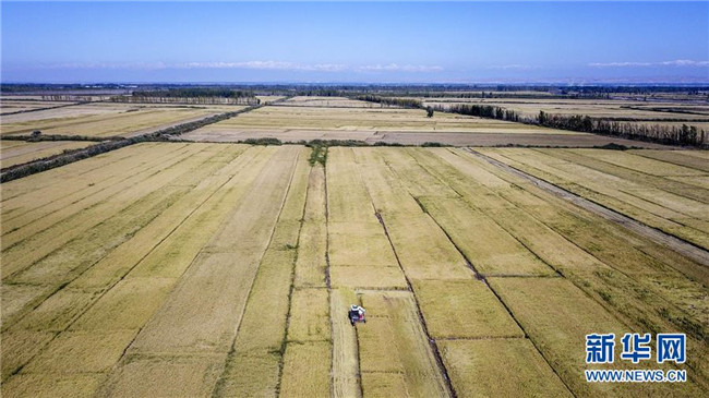 收割機在地處新疆察布查爾錫伯自治縣種羊場的“萬畝水稻優(yōu)質(zhì)高產(chǎn)高效示范區(qū)”收割水稻(9月26日無人機拍攝)。眼下,地處新疆伊犁河谷的察布查爾錫伯自治縣約20萬畝水稻迎來收割季。當?shù)剞r(nóng)民搶抓農(nóng)時,忙碌在金色田園中。記者 胡虎虎 攝