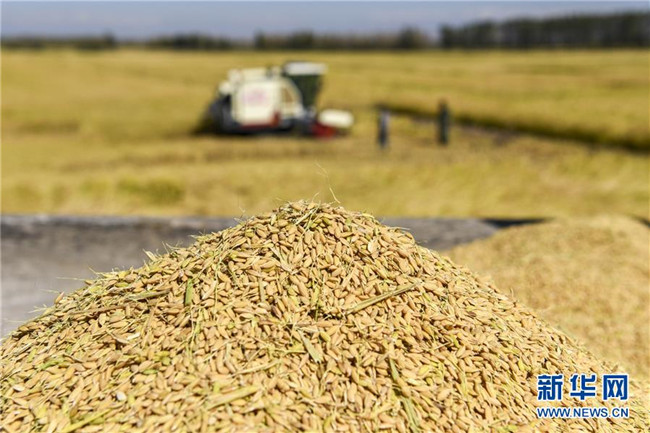 9月26日,收割機在新疆察布查爾錫伯自治縣納達齊牛錄鄉(xiāng)的一處稻田收割水稻。眼下,地處新疆伊犁河谷的察布查爾錫伯自治縣約20萬畝水稻迎來收割季。當?shù)剞r(nóng)民搶抓農(nóng)時,忙碌在金色田園中。記者 胡虎虎 攝