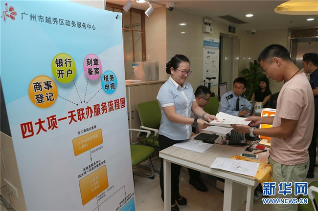 7月19日,“四大項一天聯(lián)辦服務(wù)專窗”在廣州市越秀區(qū)政務(wù)服務(wù)中心亮相,工作人員將營業(yè)執(zhí)照遞交給申請者。 新華社記者 張加揚(yáng) 攝