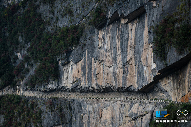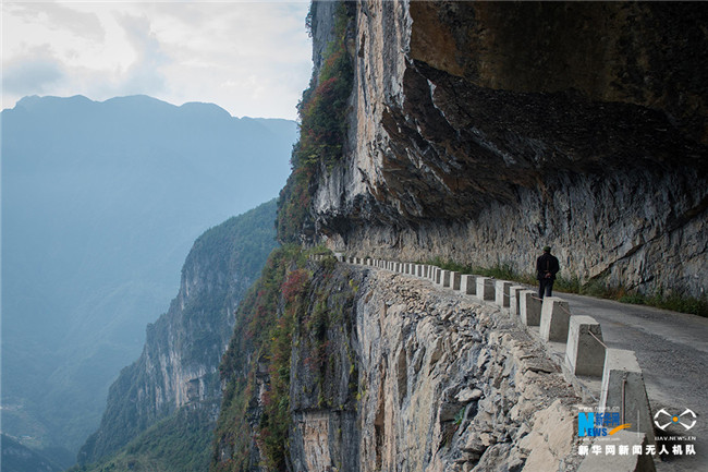 稱其“懸崖天路”,來源于其險要的地勢——上方是巖石,外側(cè)是懸崖峭壁。由于地處海拔1500米的高山,常有云霧繚繞,驚險萬分。新華網(wǎng) 李相博 攝
