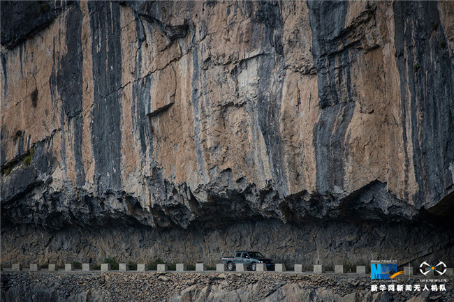 經(jīng)過一年多的時間,村民終于人工鑿出這條595米的懸崖公路,給當(dāng)?shù)貛砹讼M?。新華網(wǎng) 李相博 攝