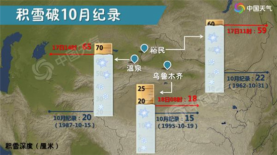 受強冷空氣影響,17日新疆伊犁河谷平原地區(qū)出現近28年以來最早大范圍初雪,首府烏魯木齊也降下今年下半年的初雪,較常年初雪日10月23日(1981-2010年)略早。昨天早晨降雪持續(xù),8時烏魯木齊積雪已經達到18厘米,打破了當地10月份的積雪紀錄,并且最低氣溫首度“破冰”只有-1℃。受其影響嗎,新疆暴雪、大風、寒潮、霜凍、道路結冰、沙塵暴6個預警齊發(fā),惡劣天氣為農牧業(yè)生產、林果業(yè)、交通旅游、城市運行等帶來了不利影響。