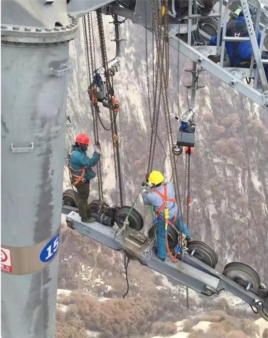 站在支架頂上,迪冰瑤用雙手將100斤重的導(dǎo)鏈吃力地舉過(guò)頭頂安裝固定好,然后開(kāi)始校正鋼索。