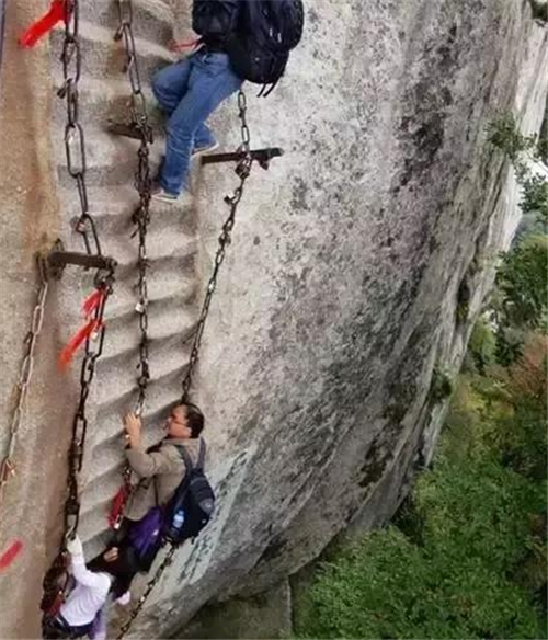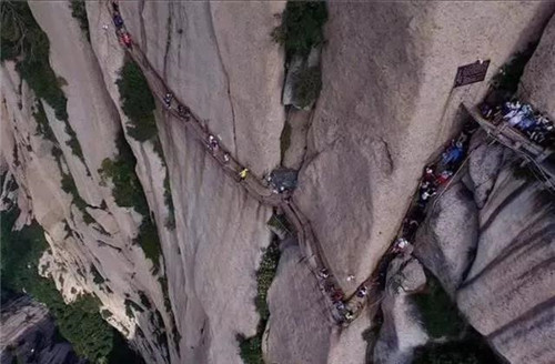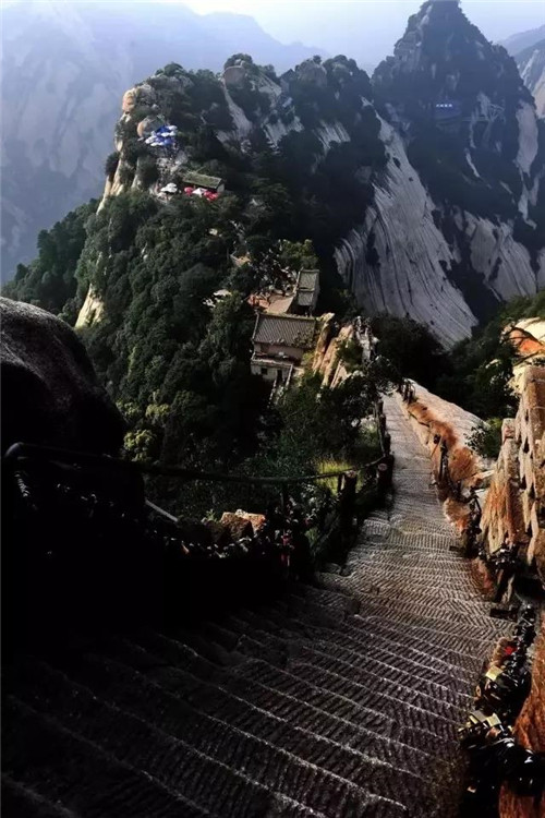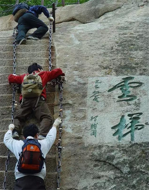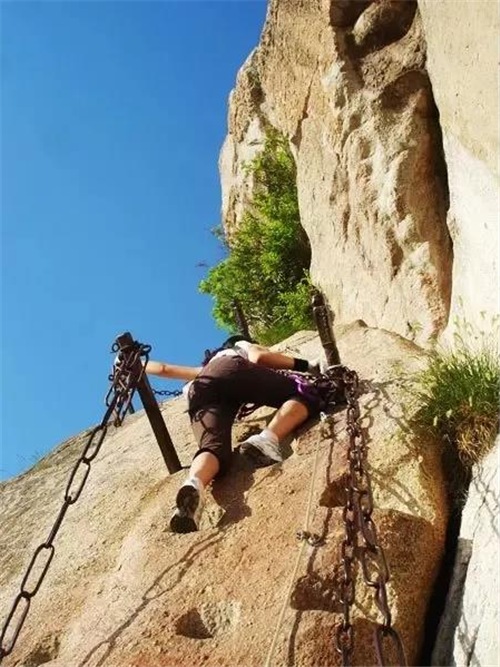 與雄壯挺立相生相伴的是險(xiǎn)要和陡峭。華山的雄偉之勢,正是由它險(xiǎn)峻的山峰特征所造就的。具體體現(xiàn)在兩個(gè)方面。一是山體拔地而起,橫空出世,山崖垂立,溝壑深邃:二是嶺脊如削,中突旁落,登山道路多沿嶺就崖而鑿,地勢險(xiǎn)要,而且古時(shí)路階僅能容足,須手腳并用才能攀登。因此,華山被稱為“奇險(xiǎn)天下第一山”也就理所當(dāng)然。清代文學(xué)家袁枚在其《登華山》詩中這樣描繪華山之險(xiǎn):“絕壁納雙踵,白云埋半腰,忽然身入井,忽然影墜巢。無路望已絕,云棧斷復(fù)交。驚魂飄落葉,定志委鐵鐐。”