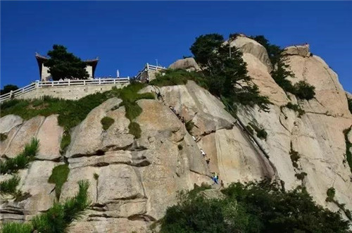 云梯,是從引鳳亭經(jīng)東石樓峰通往東峰的一段捷徑,云梯高十余米,與地面垂直呈90度角,中上部外突,呈倒坎崖之勢。梯上置懸索三條,游人挽索而攀,身體無法貼近崖壁,因而隨索擺動(dòng),心旌神搖,如同云駕霧,故名云梯。