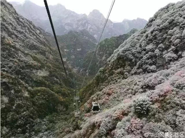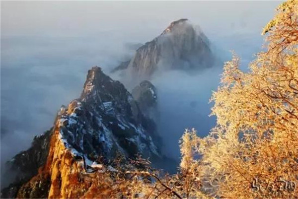 當(dāng)滿山的紅葉還依舊掛在樹枝,露出嬌羞的笑臉時(shí),秋末的華山,已經(jīng)下起了今年的第一場(chǎng)雪。放眼望去,整座山體好像被薄薄的彩衣包裹,若隱若現(xiàn)。