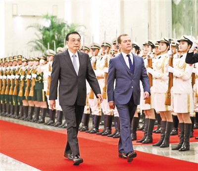 11月7日,國(guó)務(wù)院總理李克強(qiáng)在北京人民大會(huì)堂與俄羅斯總理梅德韋杰夫共同主持中俄總理第二十三次定期會(huì)晤。會(huì)晤前,李克強(qiáng)在人民大會(huì)堂北大廳為梅德韋杰夫舉行歡迎儀式。新華社記者 丁海濤攝