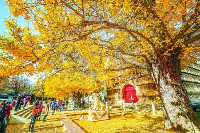 金秋時節(jié),京城各公園和景區(qū)落葉繽紛,美景如畫。昨天,北京石刻藝術(shù)博物館內(nèi)的真覺寺金剛寶座旁,兩株樹齡近600歲的古銀杏樹一片金黃,吸引市民觀賞留影。本報(bào)記者 武亦彬攝