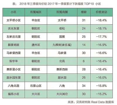 一是品質(zhì)較差的老房子。2018年三季度均價(jià)較2017年一季度均價(jià)累計(jì)跌幅最大的是物業(yè)費(fèi)低于3塊、30年以上的房屋,表明品質(zhì)差的老房屋抗跌性較弱。比如,石景山由于區(qū)域內(nèi)房源房齡較大,均價(jià)回調(diào)幅度也較大,2018年三季度累計(jì)跌幅達(dá)9.0%。篩選2018年三季度均價(jià)跌幅TOP10 小區(qū),多數(shù)樓齡在20年以上。