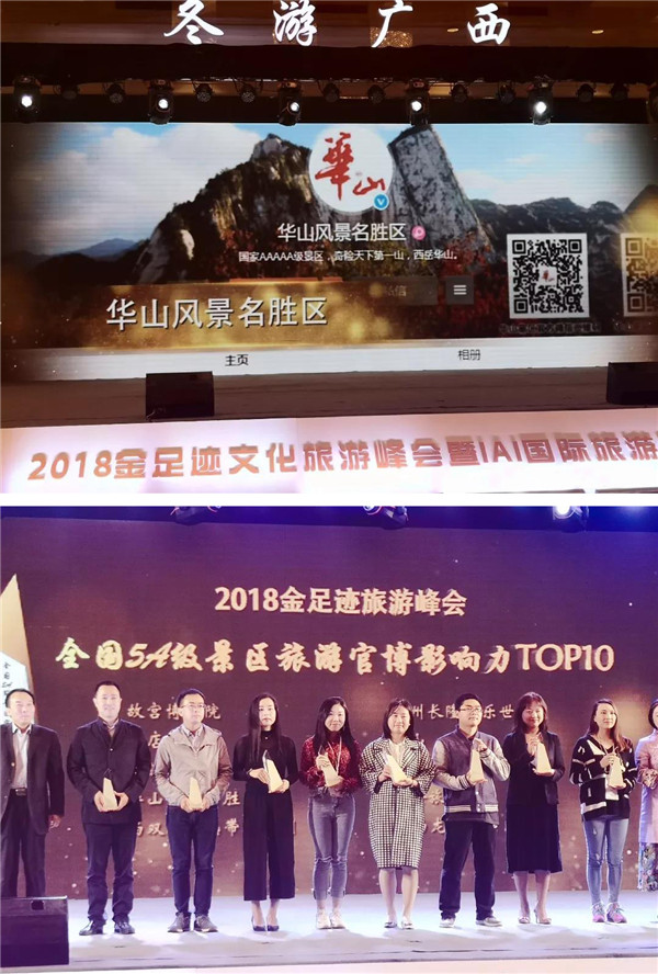 金足跡文化旅游峰會是由新浪網(wǎng)、微博打造的全國性旅游峰會,是旅游行業(yè)的年度大會。本次峰會上發(fā)布了《2018全國旅游數(shù)據(jù)報告》,公布全國省級旅游官博影響力TOP10、全國市級旅游官博影響TOP10、全國5A級景區(qū)官博影響力TOP10及新媒體創(chuàng)新獎名單,華山風景名勝區(qū)榮獲全國5A級景區(qū)官博影響力TOP10。