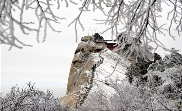 雪落華山,圣潔的雪花把華山妝扮得分外妖嬈嫵媚,平日陡峭的巖石,象穿著潔白的羽衣,宛若天仙般亭亭玉立于峰頭路旁,似向游人拂疑,微笑致意,最讓為之從心里震顏起敬的是,華山雪中松樹的雄姿與風(fēng)情。