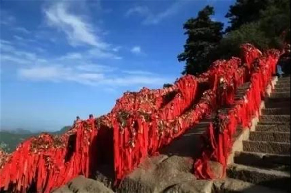 當山風徐徐吹來,長長的紅色絲繩就會隨風輕盈的舞蹈起來,如輕盈的飛鳥,比翼雙飛將愛情的甜蜜帶到華山的每一個角落,將愛情的誓言印刻在每一塊充滿靈性的石頭上。