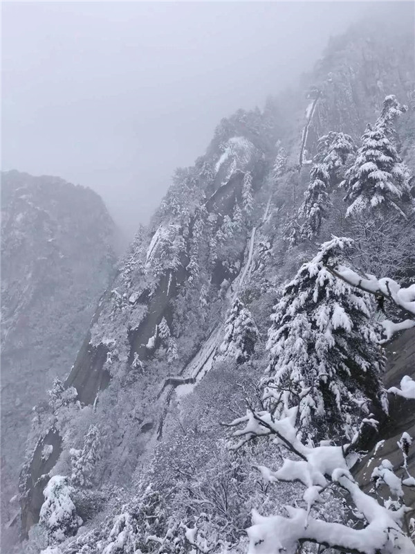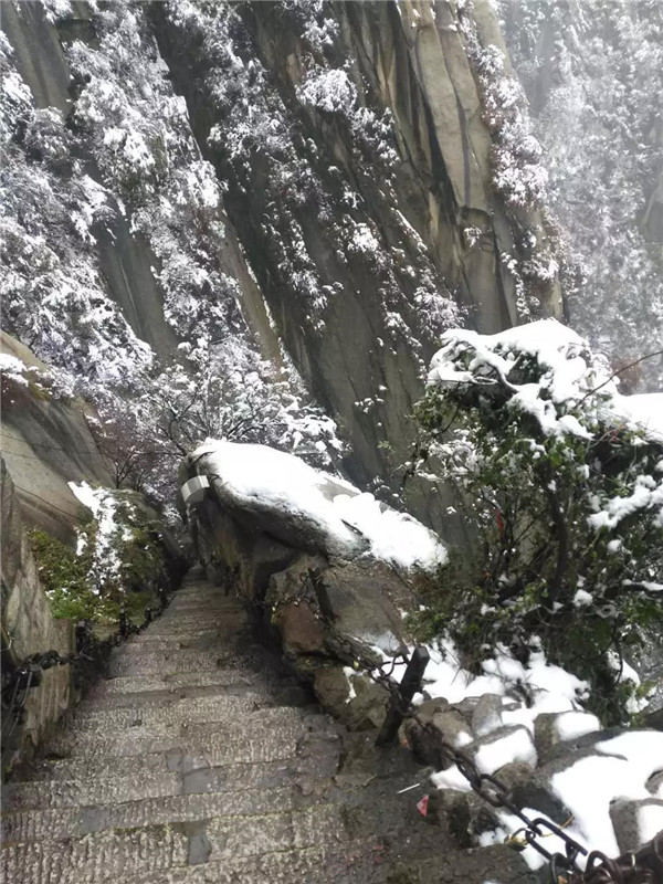 到了北峰和蒼龍嶺,這才是真正的華山,天氣不好,但是一樣很美。到處銀裝素裹,走在蒼龍嶺,這里有“韓愈投書”的故事,左手懸崖,右手深淵,就像這天地間孤獨(dú)的俠客,頭頂上傳來雷音陣陣,難道有修道高人在渡雷劫,準(zhǔn)備羽化成仙?